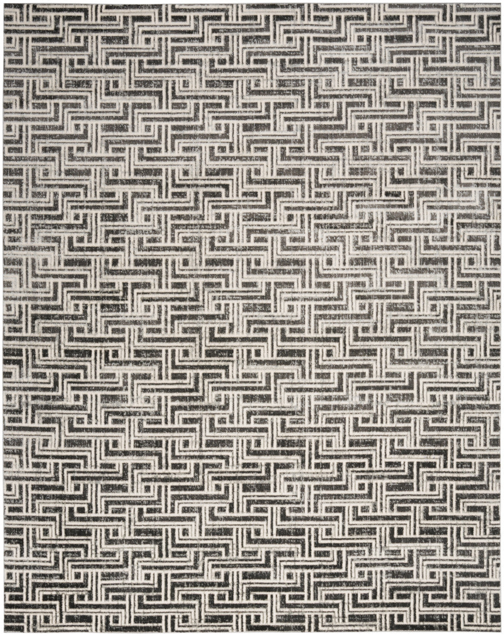 - Modern gray area rug made from synthetic material with a machine-made construction.