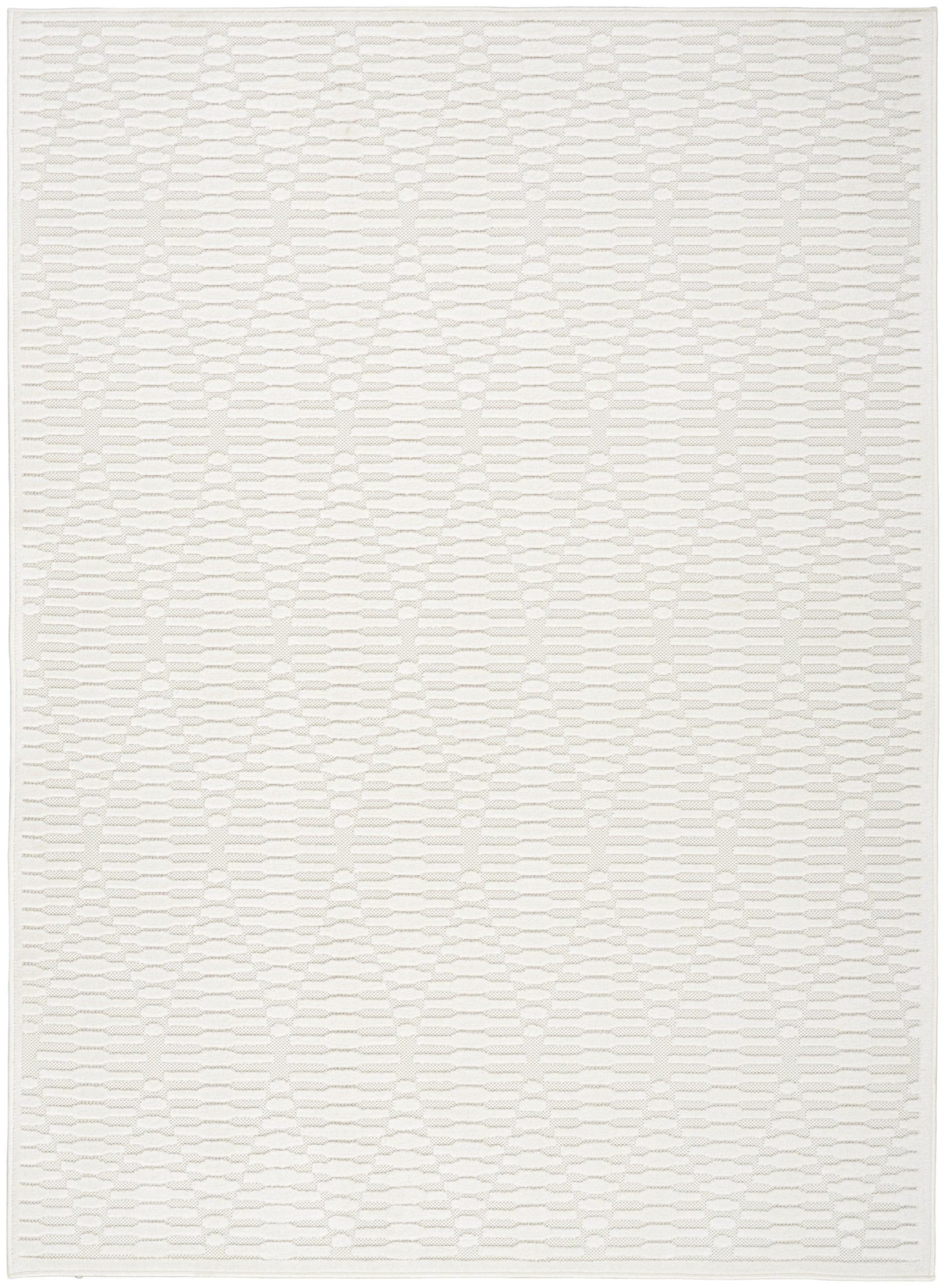 - Modern ivory area rug, machine made from durable polypropylene for easy maintenance vacuuming without a beater bar/rotating brush.