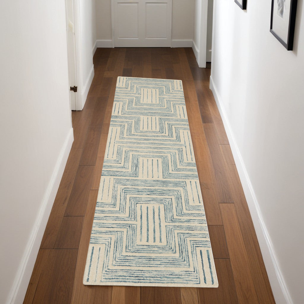 Add great coloration and comfortable texture to your space with this 8-foot ivory and turquoise wool geometric runner rug. Rugs are a great way to showcase your style, hide imperfections, warm your home and reduce noise. This rectangular shaped rug features a abstract design that will add a functional and decorative accent to your space. This modern styled runners makes a great accent for the hallway, in front of cabinets, in the laundry room, or any other space you need a narrow and long rug. 27-inch h x 90-inch w x 0.5-inch d
