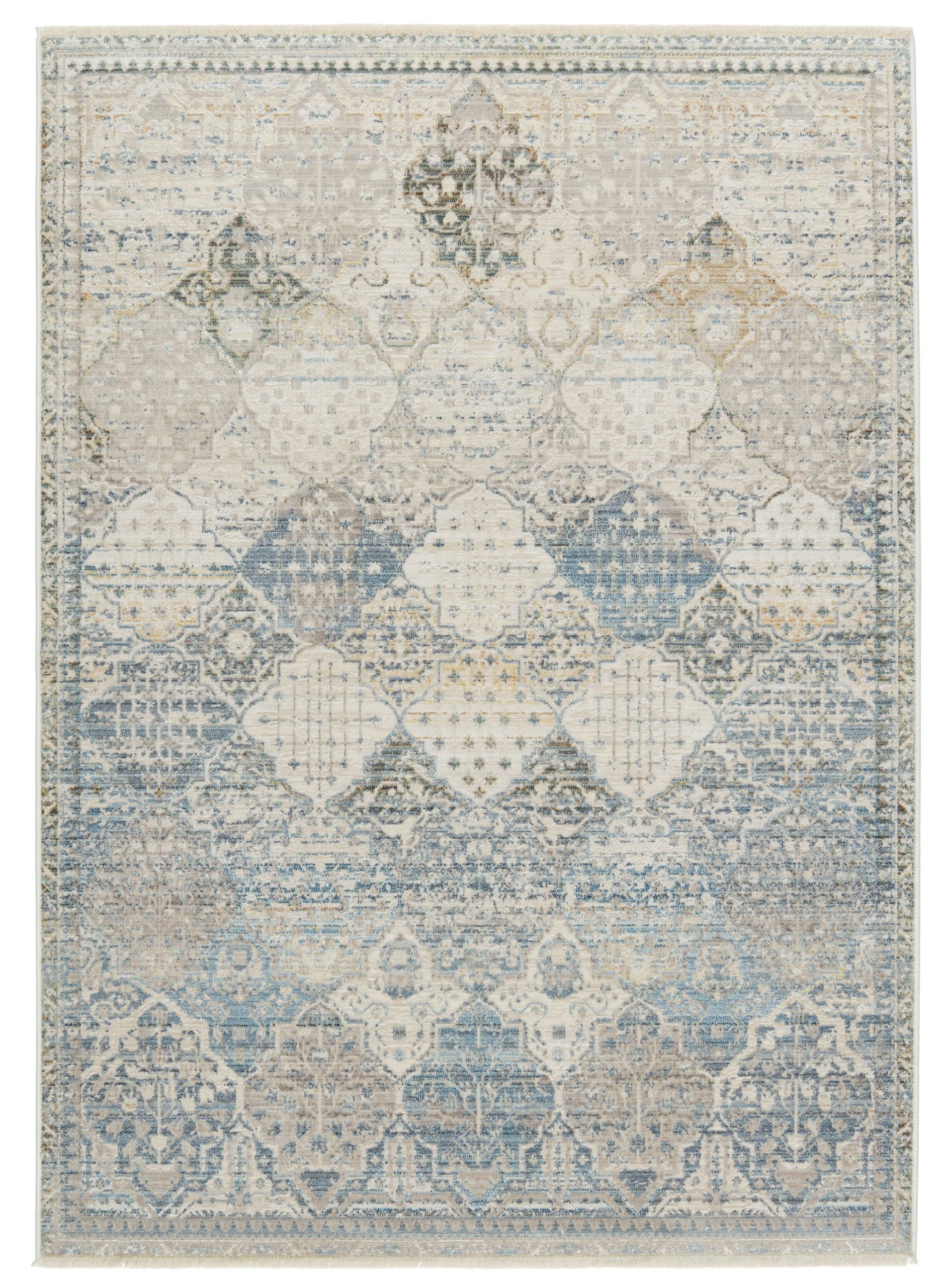 Elegantly abrashed and rich with contemporary charm, the Audun collection is an assortment enchanting styles with subtle pops of color. The Prado area rug features a Moorish tile motif in tones of blue, ivory, gray, and gold. The textured polyester pile boasts a carved-like feel for added dimension and depth. Coordinating fringe emulates the details of handcrafted, vintage textiles for a touch of global flair.