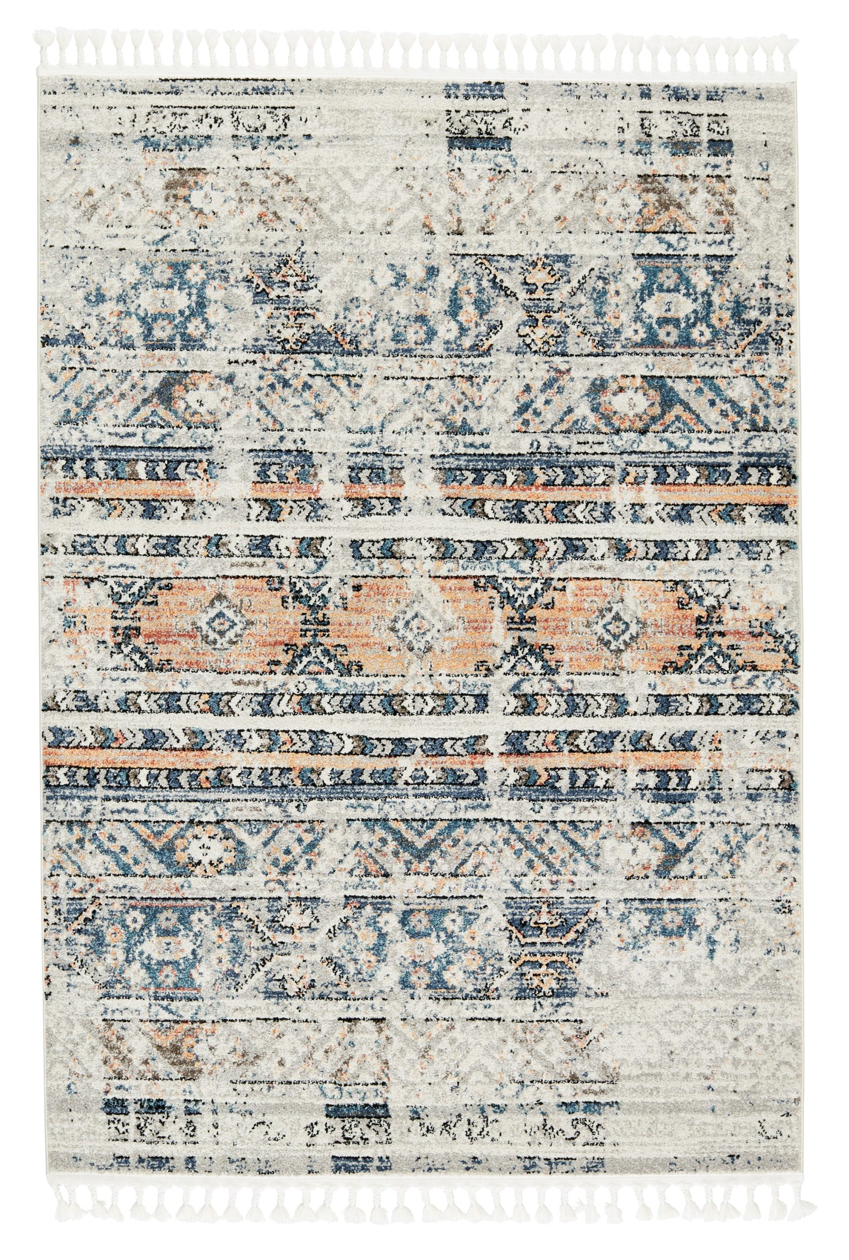 The Bahia collection lends a global vibe to any space with a modern twist on classic Moroccan motifs. The Camili rug features a distressed tribal design in an updated colorway of blue, light orange, black, ivory, gray, and brown. Soft to the touch, this medium plush rug emulates the inviting and worldly style of authentic flokati rugs, but in a durable polypropylene power-loomed quality. Braided fringe accents further the boho-chic appeal of this unique rug.