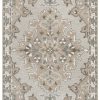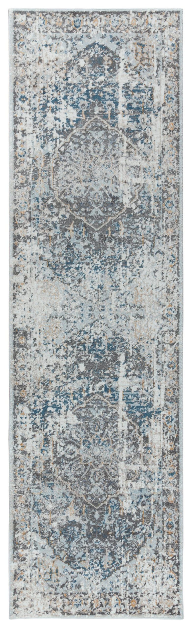 Explore the single height pile of this Rizzy Home Floral Medallion Bristol Rug, to find the hidden treasure of vintage style and design. Hints of blue, grey, ivory, and a touch of gold bring the once bold pattern to view — a cherished rug passed down from generation-to-generation. This piece is power-loomed of durable synthetic fibers to provide you with softness under your feet and consistent quality.