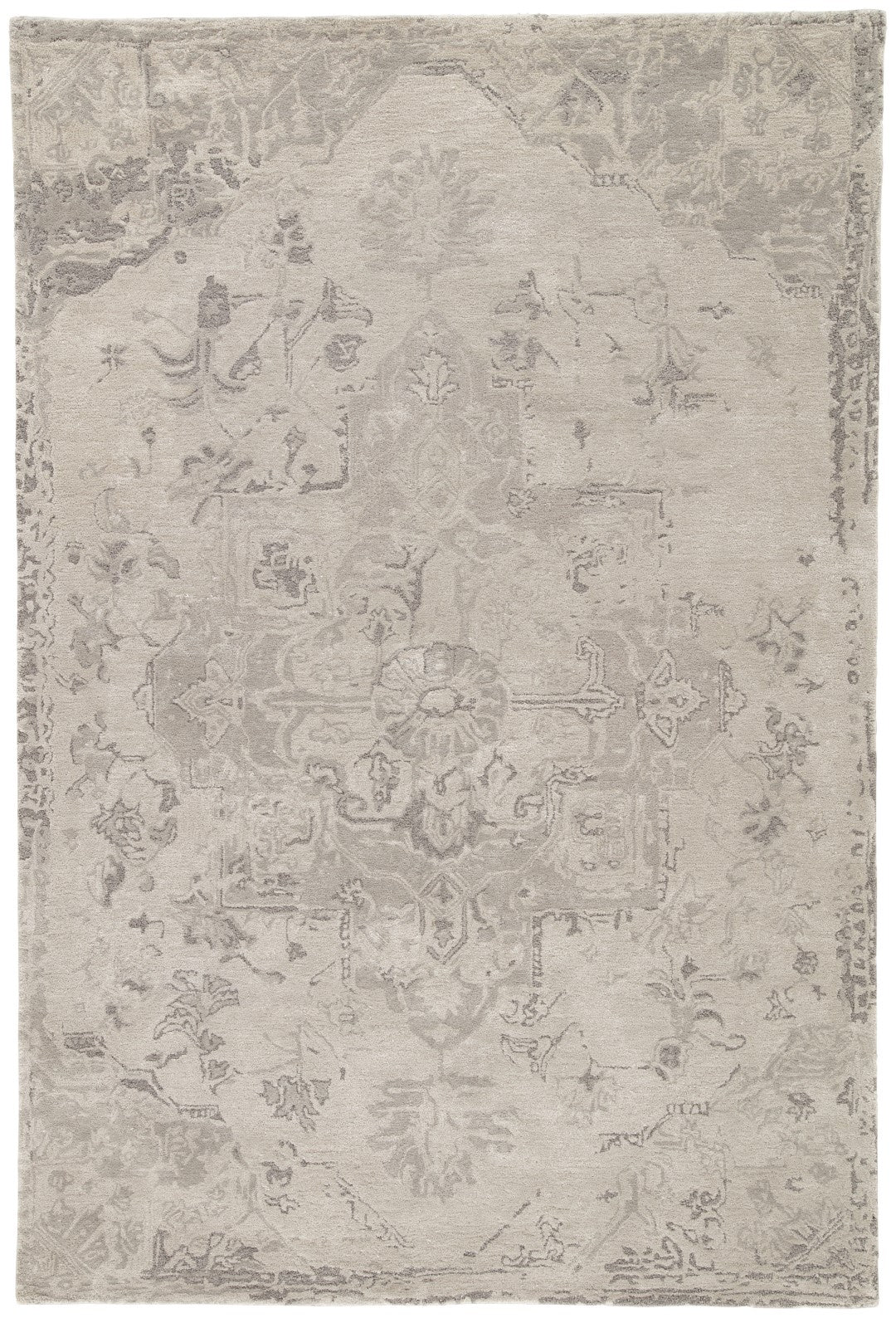 The Citrine collection is an assortment of distressed Old World patterns reinterpreted for modern design. The hand-tufted Sasha rug features an antiqued center medallion in neutral hues of gray and beige. Made of wool and viscose, this timeless rug boasts an ultra-soft feel and elegant sheen.