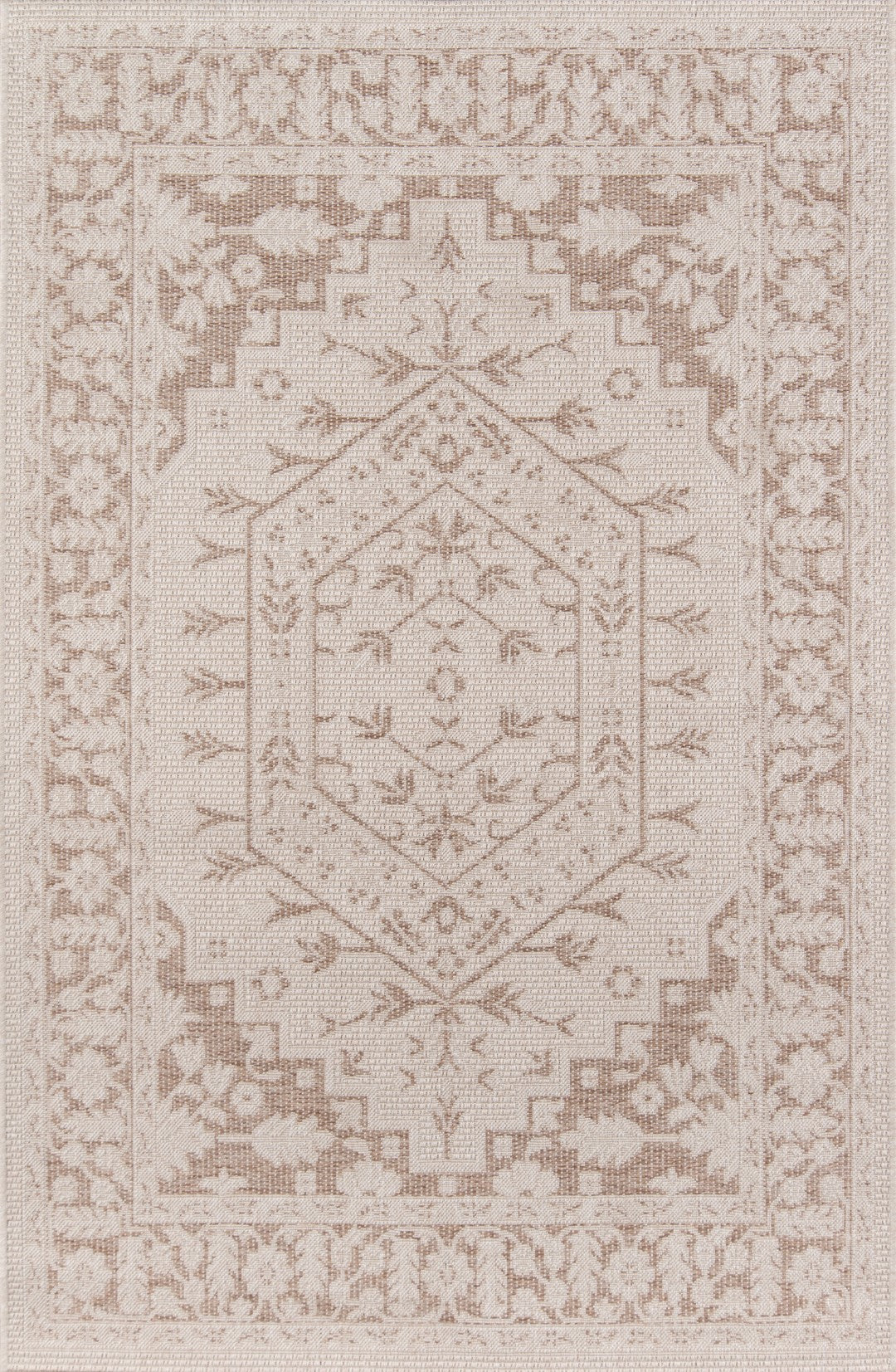 Whether dining al fresco or relaxing poolside, this indoor/outdoor area rug adds a hint of heritage style to every atmosphere. The tone-on-tone beige rug is a breath of fresh air beneath patio furniture and deck chairs, adorned with a classic medallion and border design and elegant palmette, flower and leaf motifs traditionally reserved for indoor décor. Constructed from sturdy synthetic fibers, the all-weather floorcovering creates a coordinated look for interior and exterior spaces with a low maintenance fabrication ideal for leisurely living.