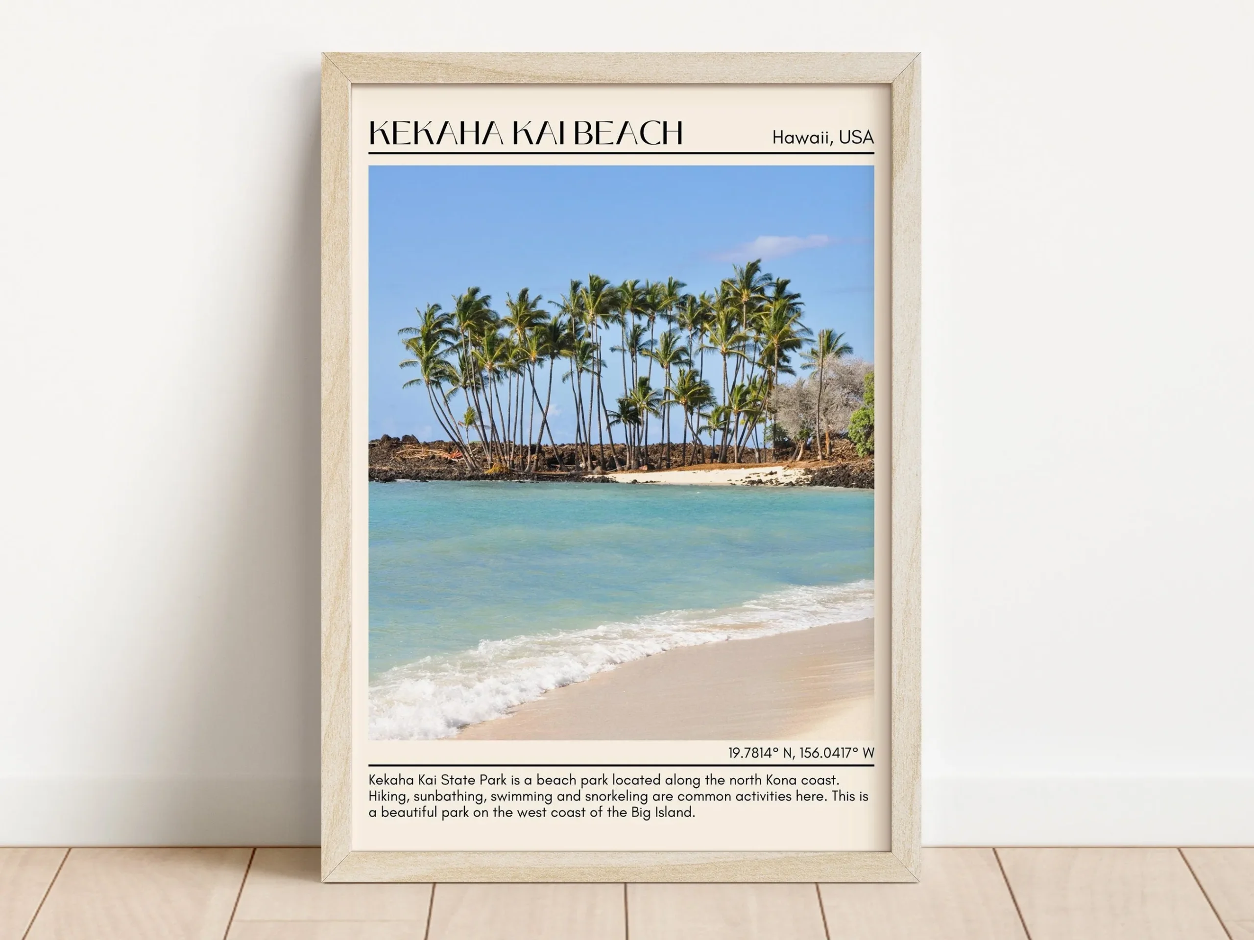 Preserve your cherished memories with our meticulously handcrafted Kekaha Kai Beach photo frame, a stunning tribute to the captivating beauty of this coastal paradise. Expertly designed, this wooden frame beautifully captures the essence of Kekaha Kai Beach, featuring its sandy shores and breathtaking landscapes.