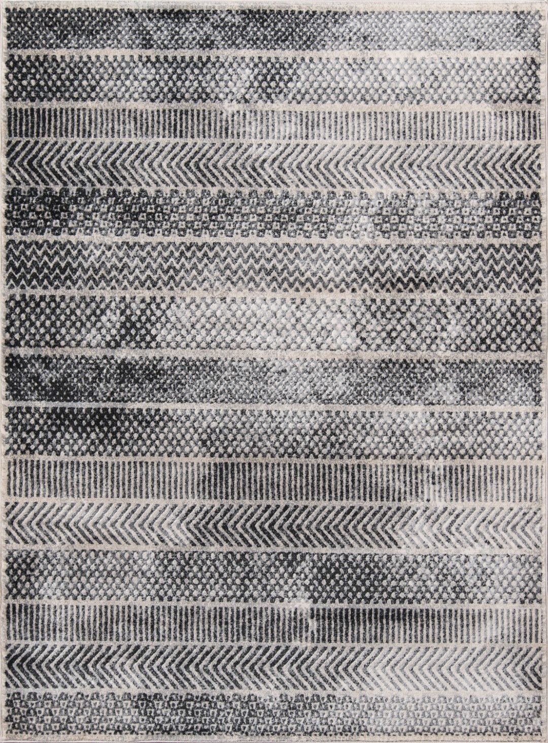 The distinctive design of this transitional area rug is truly a sum of its parts. Each row exhibits a unique pattern, as dots, dashes, zigzags and squares form a dynamic series of stripes in contrasting shades of charcoal gray and beige. Innovative manufacturing techniques replicate the artisanal quality of handmade area rugs using modern machinery, deftly weaving the decorative floorcovering from synthetic fibers that are outstanding under daily wear.