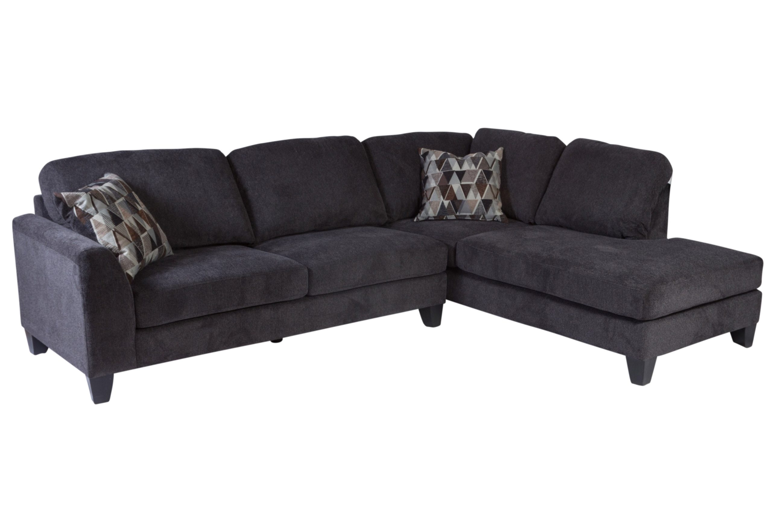 Create a modern comfort zone with our Ponderay Sectional. Upholstered in soft, dark gray microfiber, this sectional has clean lines, gently curved arms, and dense foam cushions for a transitional look that coordinates well in any home and is perfect for relaxing. Designer pillows add the finishing touch to this stylish piece.